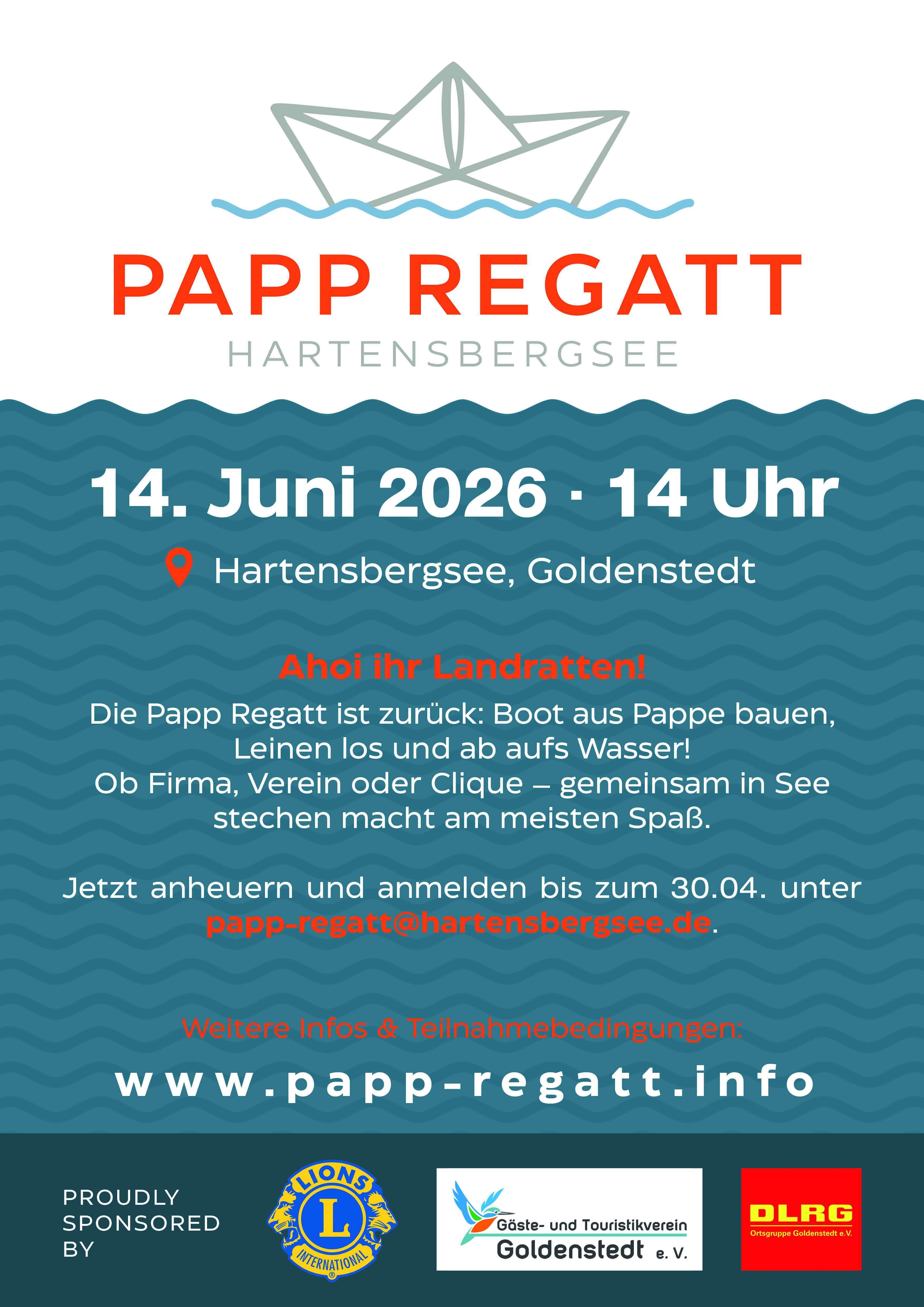 Eine Anmeldung wird bis zum 30.04.2026 unter der Mailanschrift papp-regatt@hartensbergsee.de erbeten. Die Teilnahme ist kostenlos.